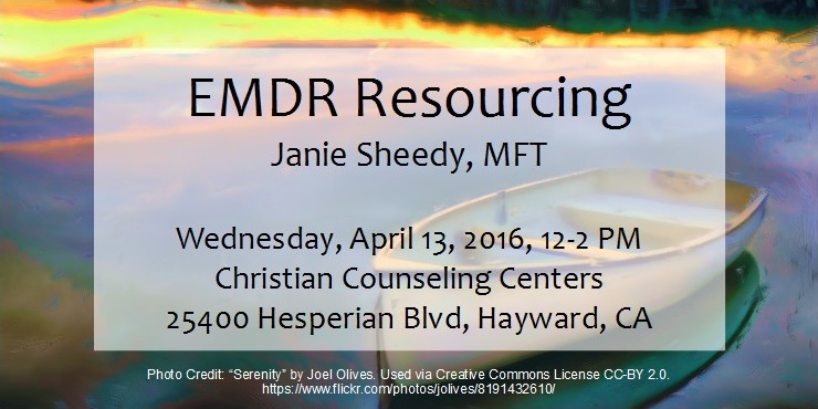 In April, the Trauma Training Program at Christian Counseling Centers in Hayward will be offering a workshop on “EMDR Resourcing,” led by Janie Sheedy, MFT. The workshop is for counselors and others who minister to trauma survivors.
